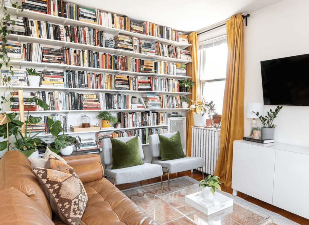 Então, que tal usar aquela parede grande para exibir sua coleção? Use uma estante de tamanho considerável (considerando a quantidade de livros, claro) ou um sistema de prateleiras criativas.