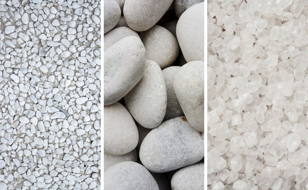 Outro jeito interessante de usar é misturar as pedras brancas com seixos, cascalhos, pedras de rio, argila expandida e até grama.