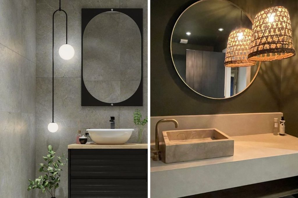 Os materiais e acabamentos dos pendentes também influenciam significativamente no visual do lavabo.