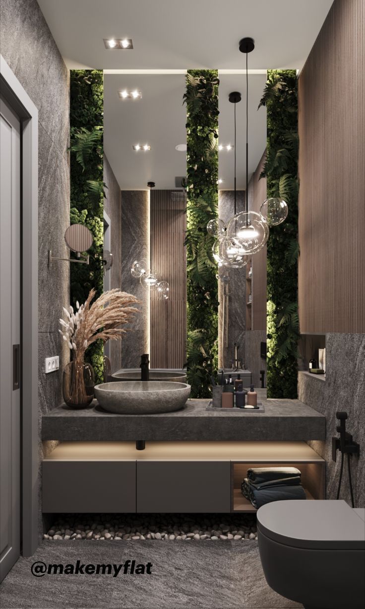 Na inspiração da imagem, os pendentes de vidro esférico proporcionam uma luz difusa que se espalha suavemente pelo lavabo, criando um ambiente relaxante e convidativo.