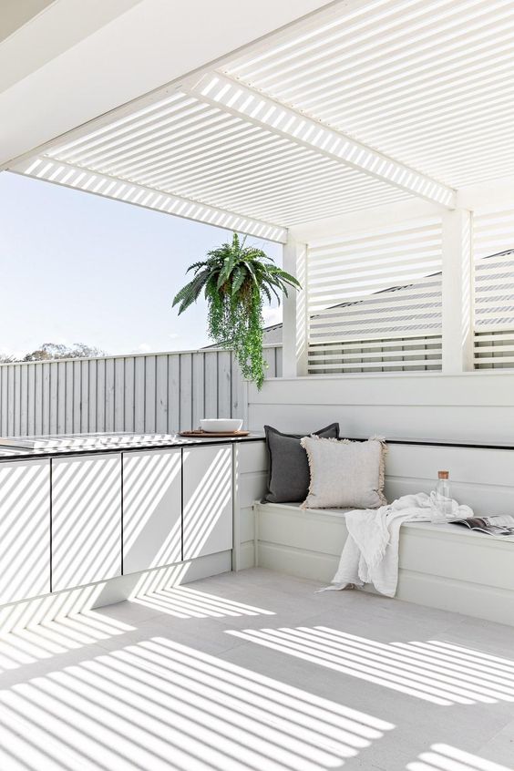 Primeiramente, observe os elementos já existentes no local. Se o acabamento de janelas, portas e guarda-corpos é branco, pode apostar no pergolado branco sem medo.