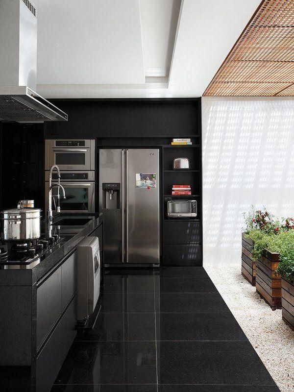 Pisos com esse material, combinam bem com armários e mobiliário em cores neutras como branco, preto ou tons de madeira clara. Elementos metálicos em aço inoxidável ou cromados também complementam muito bem o granito cinza.