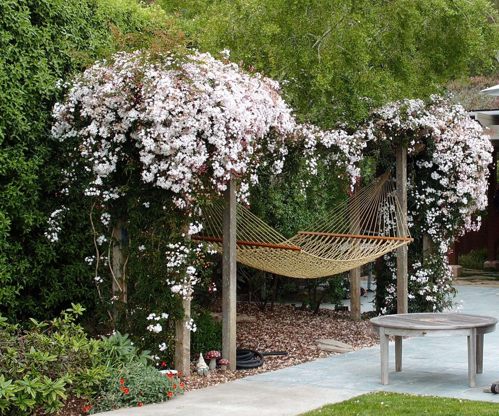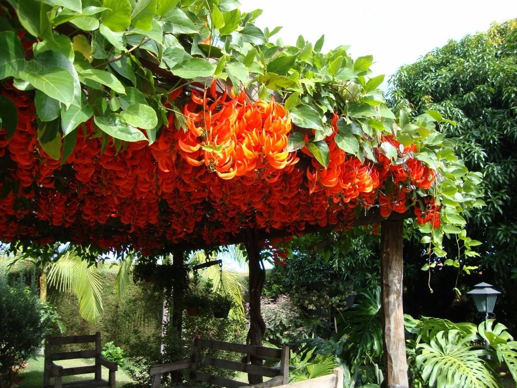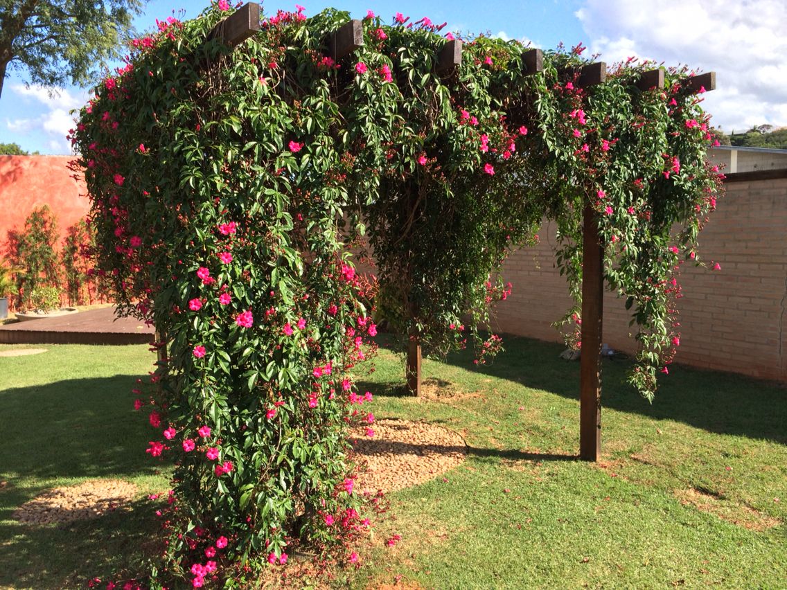 Quando o pergolado for construído para o lazer, a ideia é sempre utilizar plantas que fechem o espaço aéreo, então elas devem ter ramos longos que podem ser guiados pela armação.