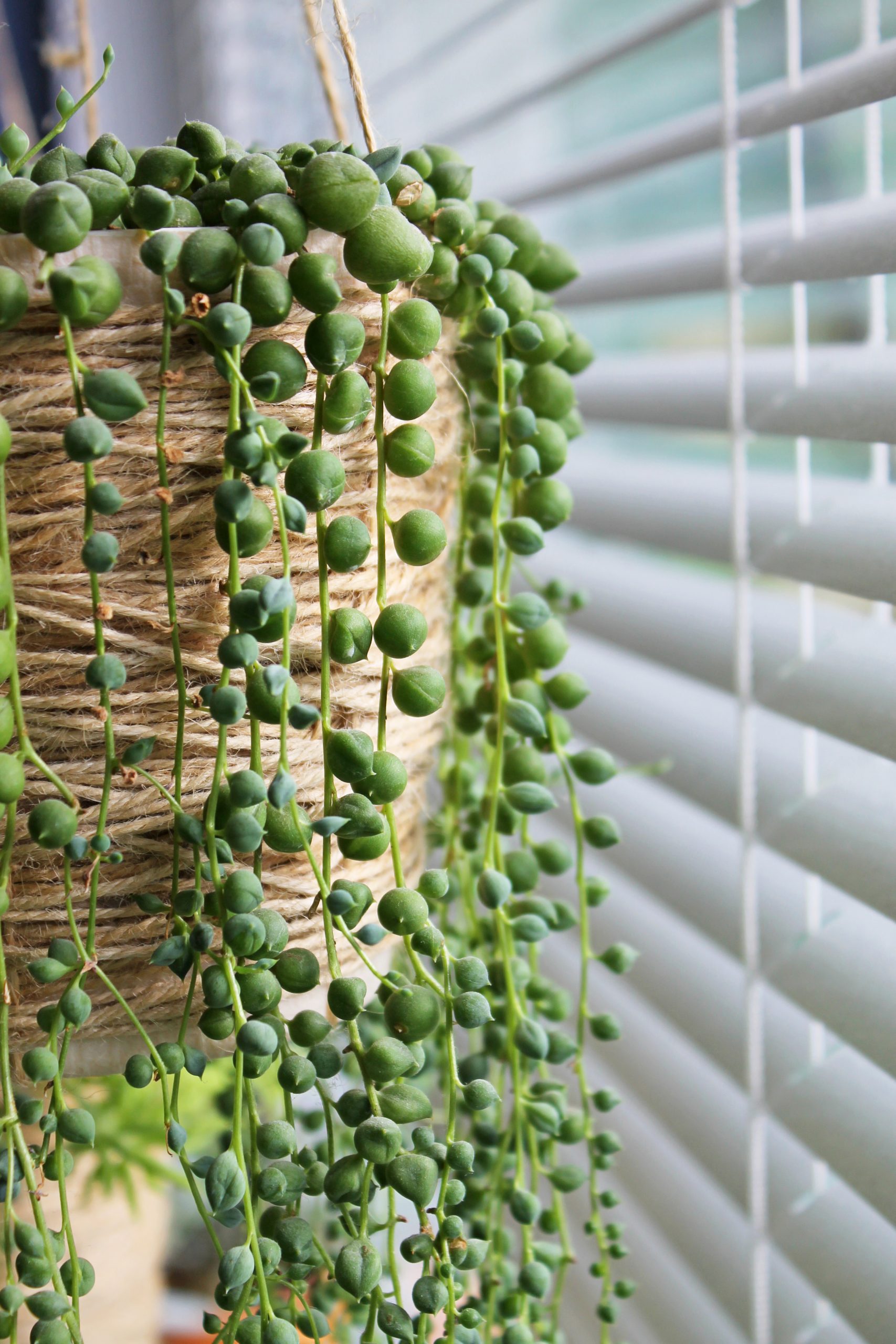 Suculenta com efeito pendente, a planta colar-de-pérolas pode ser cultivada em suportes na parede ou teto, garantindo um visual incrível para a decoração do cômodo.