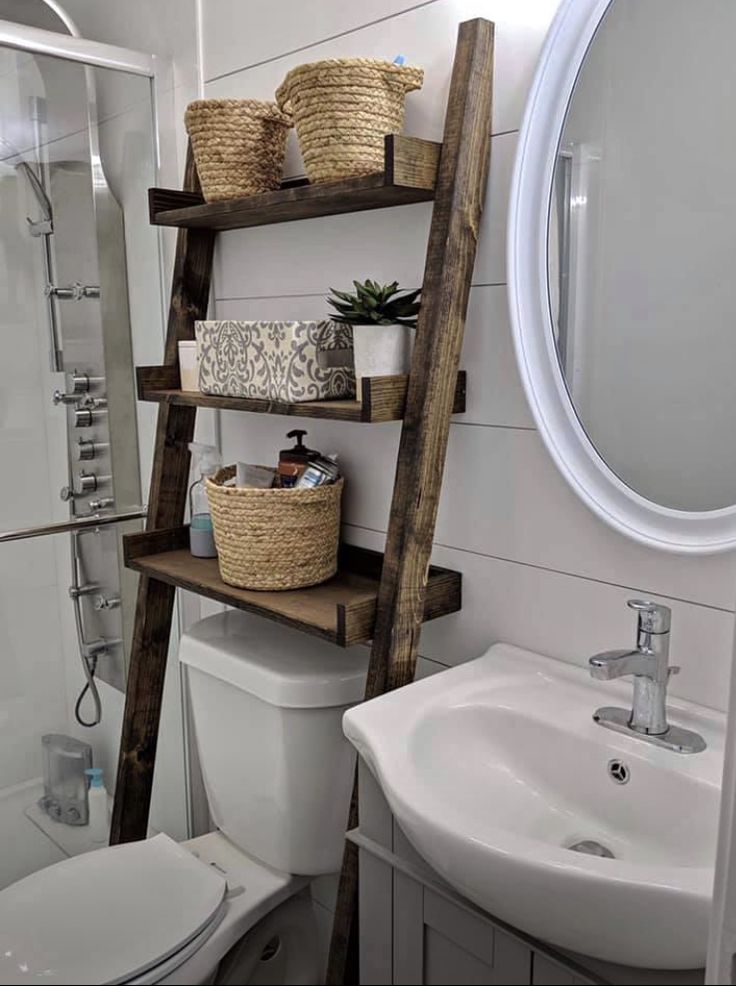 A escada prateleira é uma tendência de design que une decoração e organização, sendo ideal para banheiros pequenos.