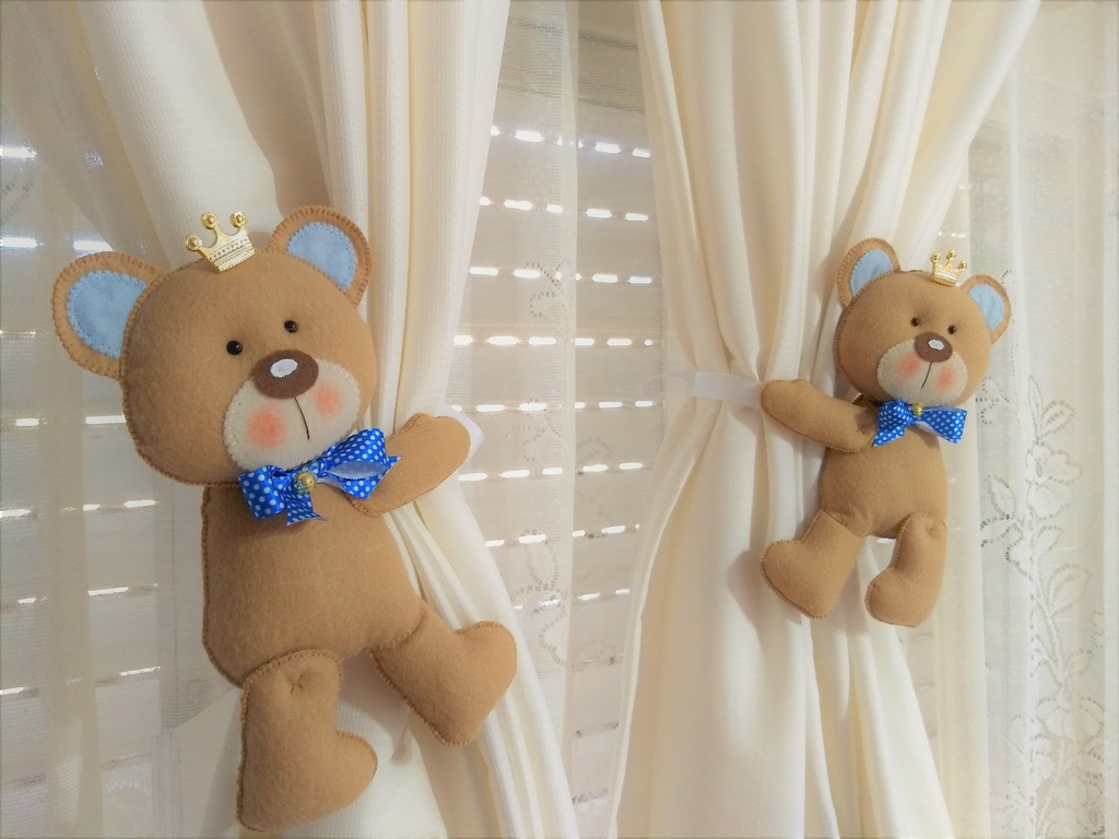 Inclusive, existem alguns em formatos de animais e bonecos que tem patas ou braços amarrados na cortina para prendê-la, dando um toque mais criativo para a decoração.