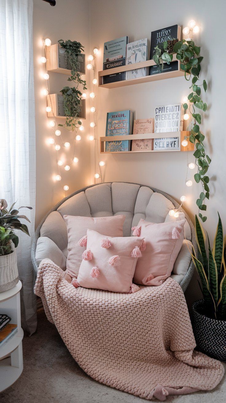 Almofadas coloridas, tapetes com estampas divertidas e luminárias criativas deixam o espaço mais aconchegante e descontraído. Vale ainda incluir peças feitas pela própria adolescente, como artesanato e customizações, tornando a decoração única e afetiva.