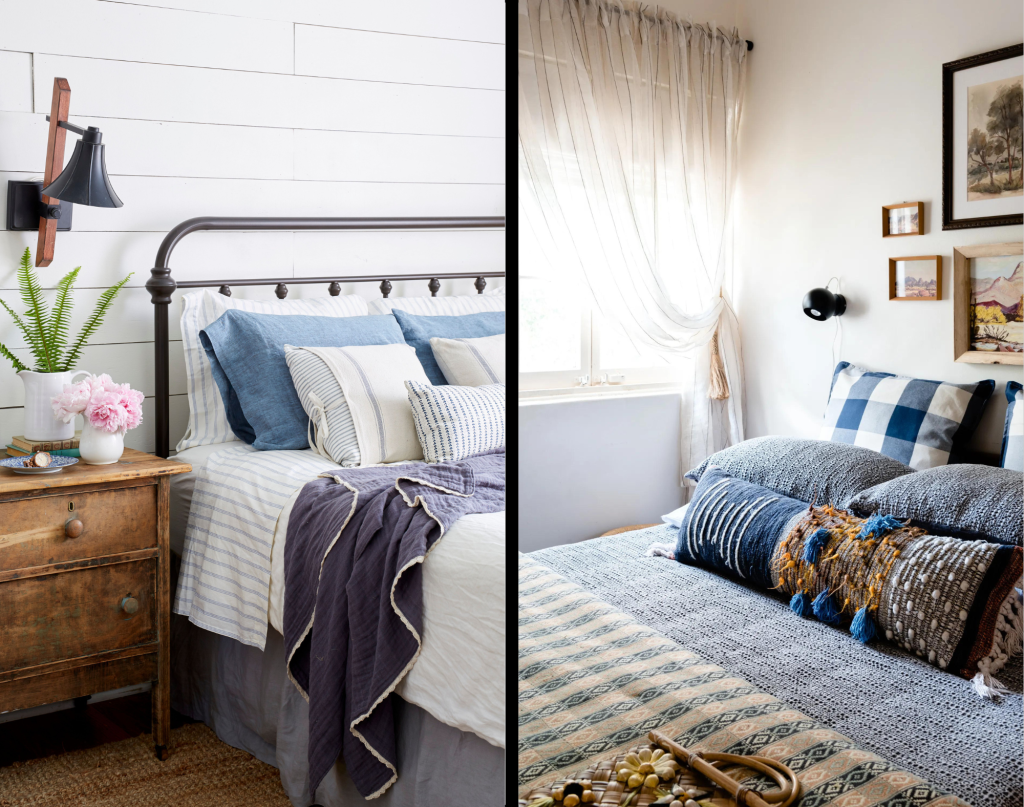 Camas de ferro forjado, mesas de cabeceira de madeira maciça e cômodas com acabamento envelhecido, por exemplo, são escolhas incríveis.