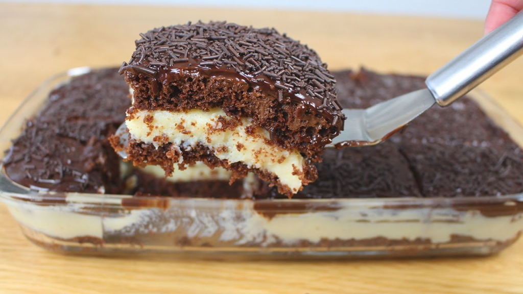 Receita de Bolo Recheado na Travessa. Fica molhadinho e super macio!