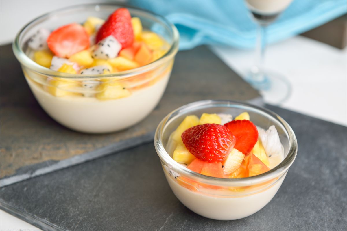 - Decore o topo com frutas frescas de sua escolha.