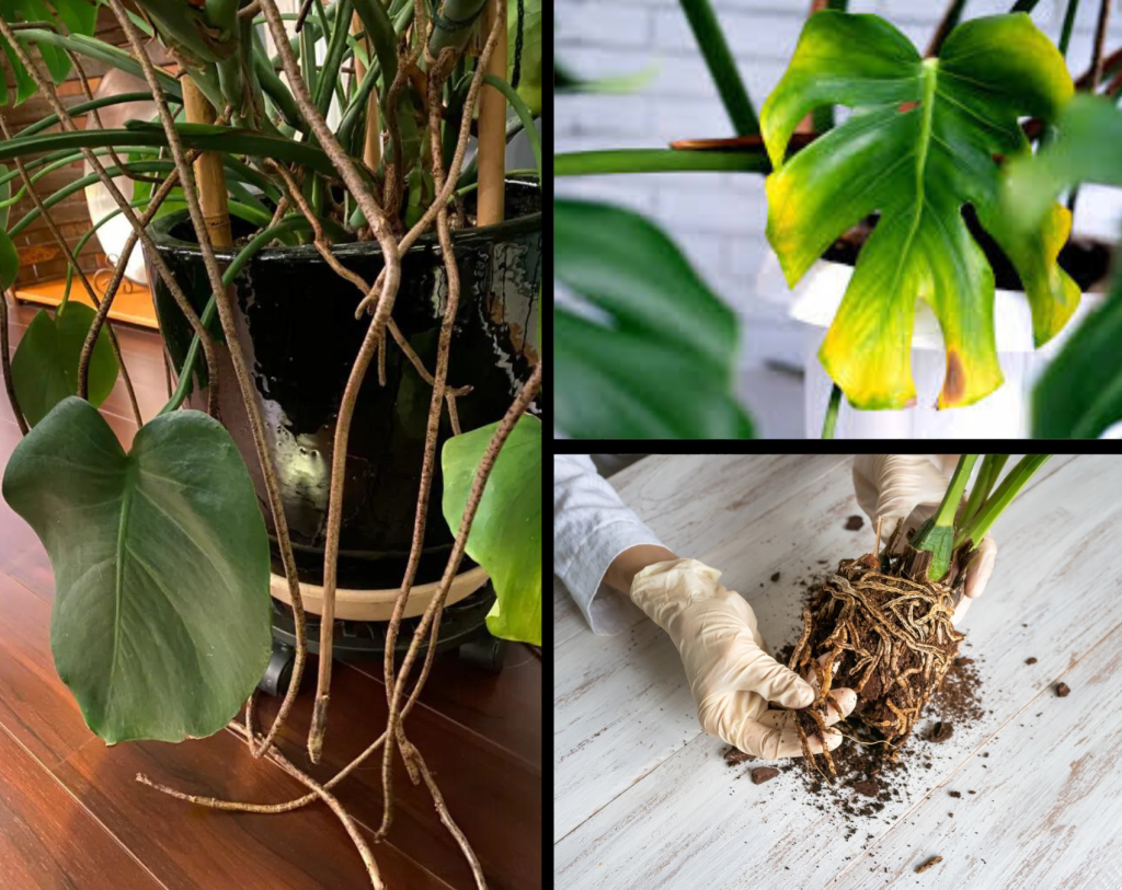 Quando as raízes da sua Monstera ficam encharcadas, a planta não consegue absorver os nutrientes necessários, resultando em folhas desbotadas e caídas.
