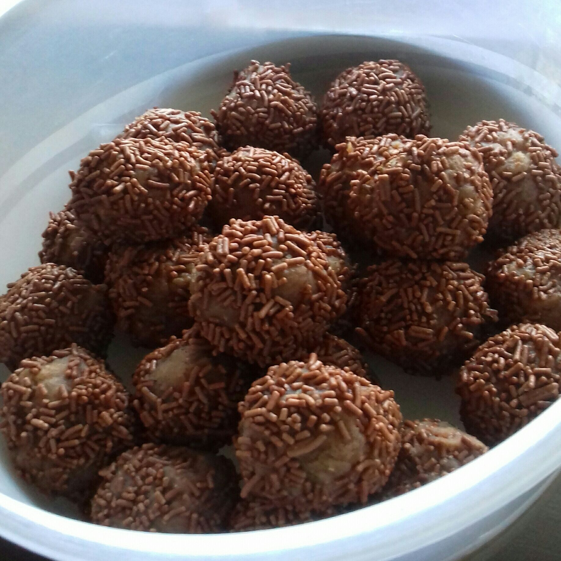 7. Transfira para um prato, aguarde que esfrie e faça bolinhas, que devem ser passadas no cacau em pó.