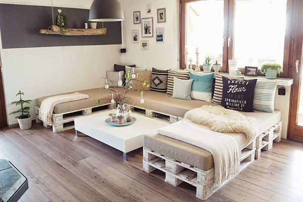 - Decoração econômica, sobretudo em comparação com o valor de sofás tradicionais, que são caros. O palete é um material com preço acessível, o que barateia o custo total do móvel e é uma excelente alternativa para quem precisar montar/decorar uma sala, mas está com o orçamento apertado;