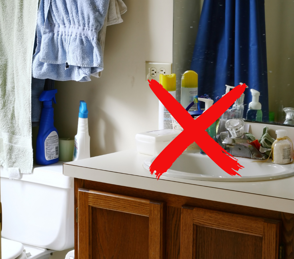 Banheiros pequenos devem ser mínimos e organizados. Muita coisa à vista gera a impressão de desordem e aperto.