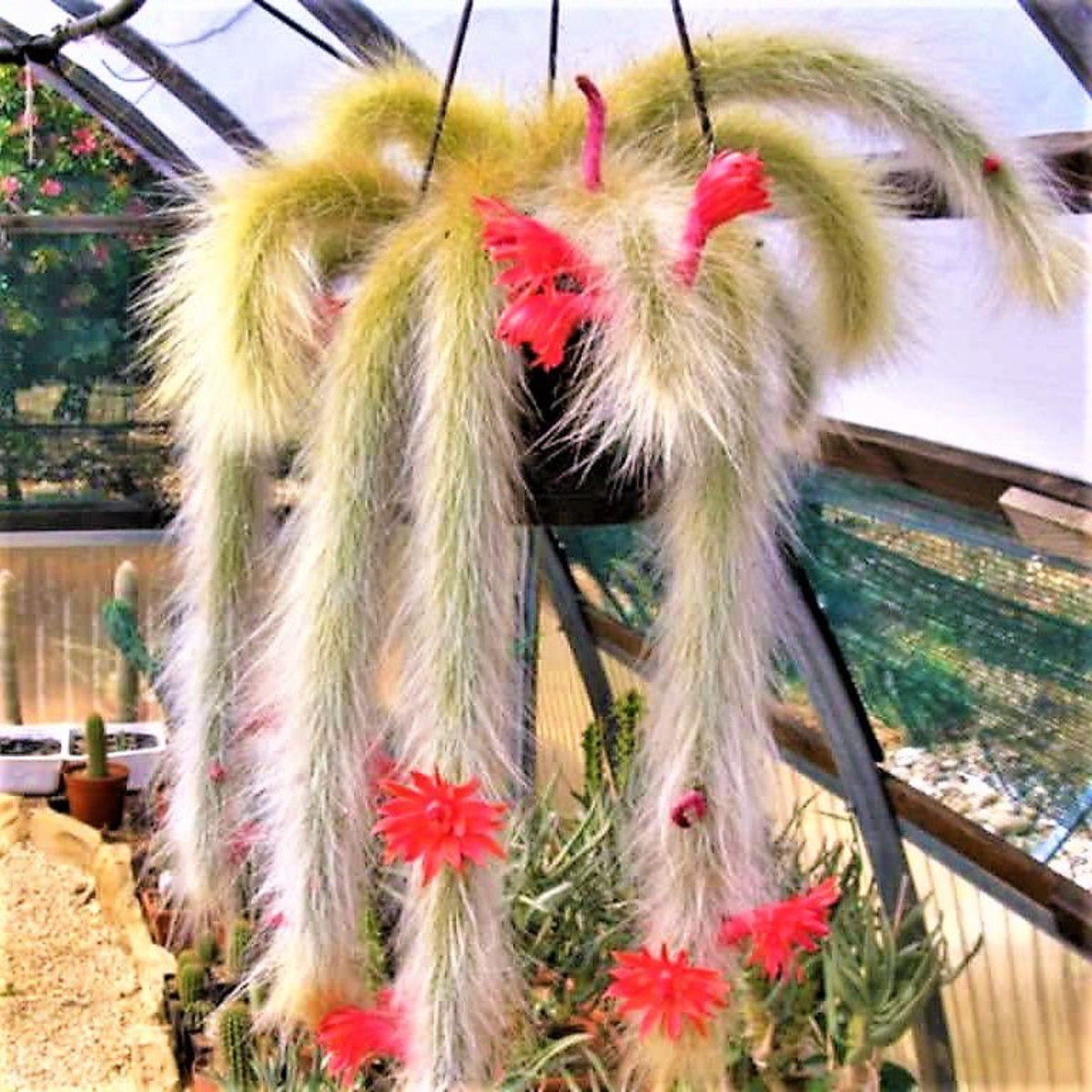 Ela pode chegar a ter até 1,20 metro de comprimento e não possui folhas, mas sim espinhos brancos que são muito finos, lembrando fios de cabelo. Exige regas moderadas, sem deixar a terra encharcada.