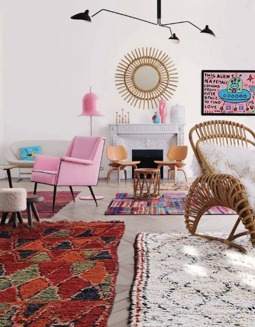 Você só tem que se atentar à escolha de cores e texturas que dialoguem com o “tapete principal”, que acabará sendo o tapete estampado. Se você tiver esse cuidado na escolha, verá que o cômodo ficará mais bonito.