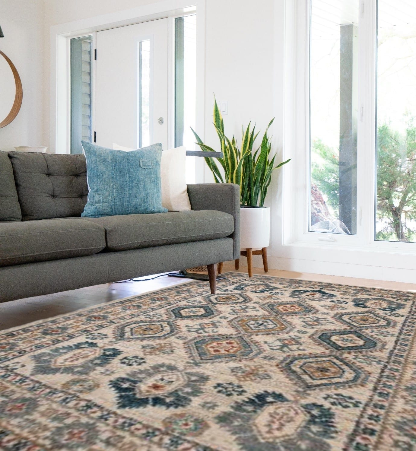 Outra vantagem desses tapetes maiores é que, se você tem uma sala grande e sente que ela está muito vazia, o tapete estampado consegue reduzir essa sensação de que o ambiente está vazio demais.