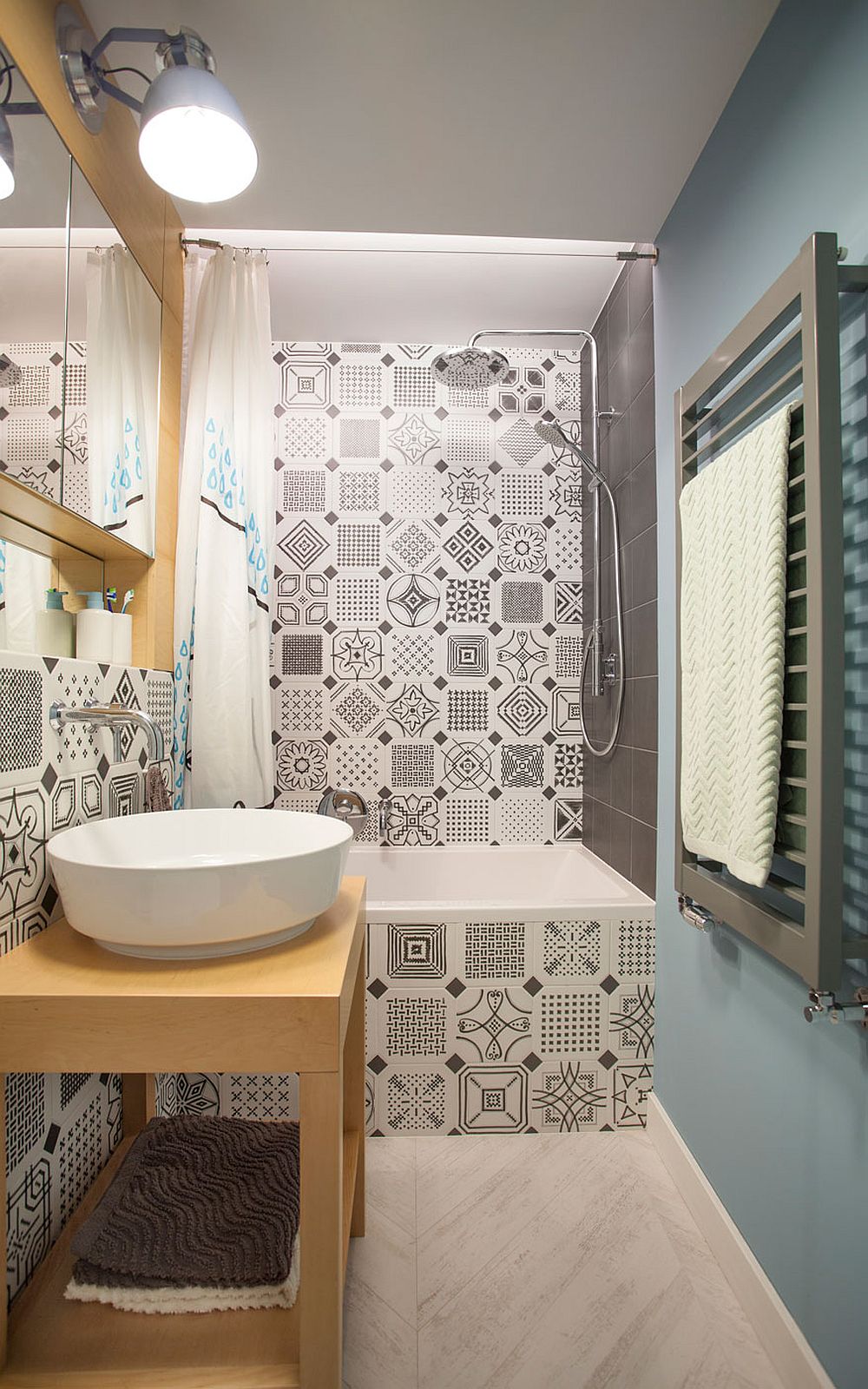 A versão branco e preto é uma das mais em alta, mas também dá para escolher azulejos estampados coloridos, para dar um toque de charme extra para a decoração. Aposte em tons de verde, lilás e azul, por exemplo.