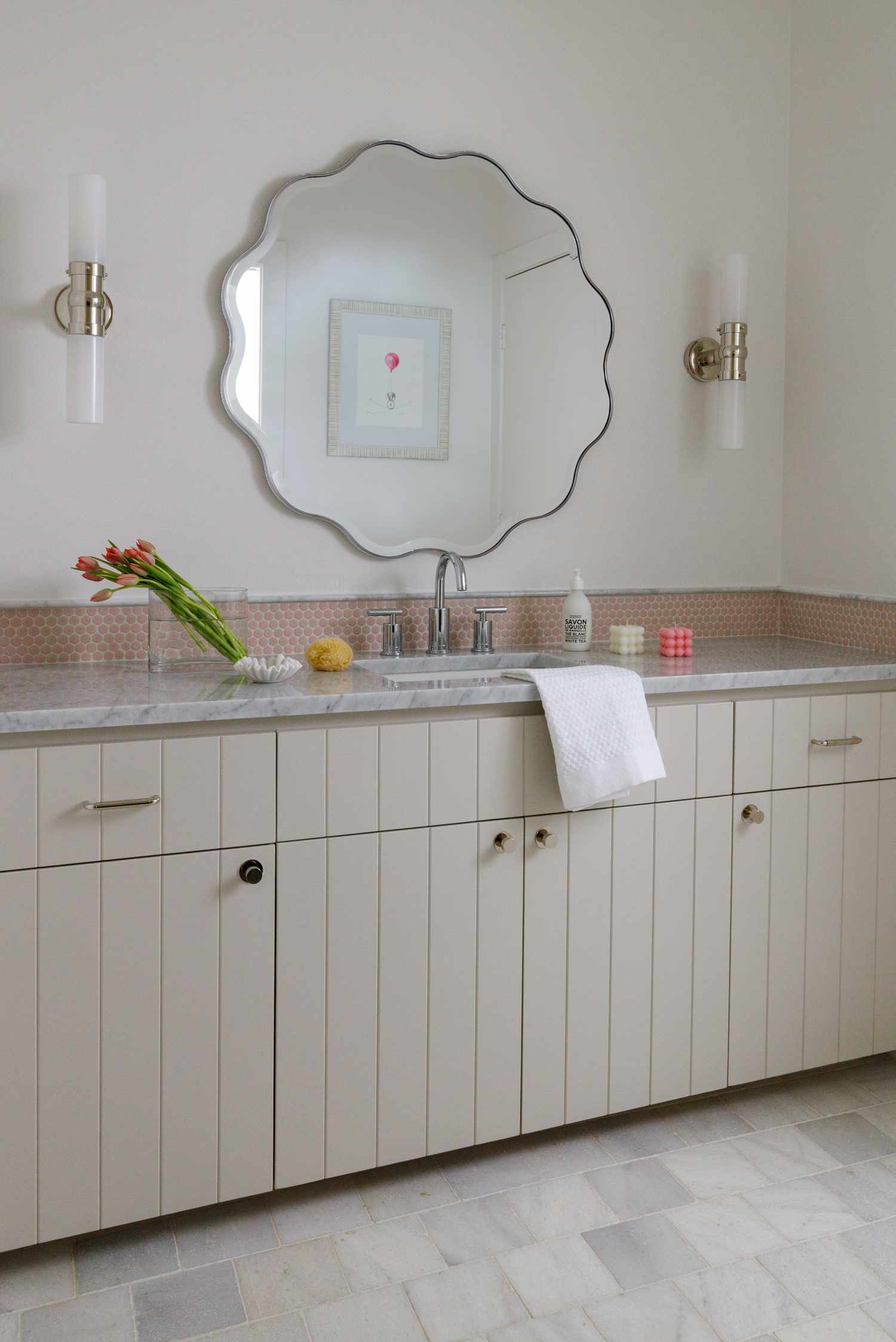 O azulejo estampado está em alta para decoração do banheiro, principalmente o que traz estampas arredondadas, lembrando uma pouco o décor usado nos anos 1960 e 1970.