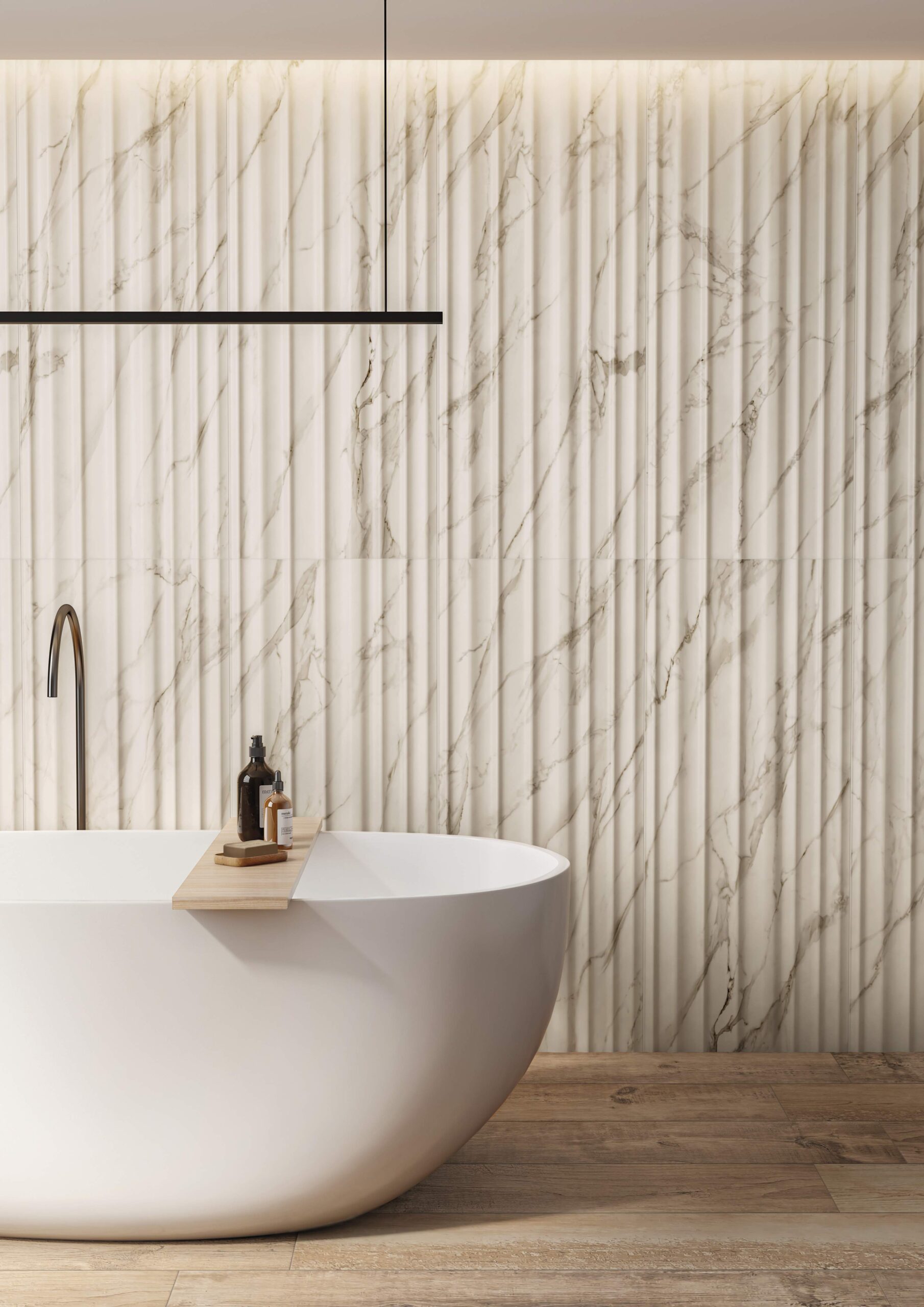 Existem diferentes formas de investir nessa tendência, sendo uma delas instalar azulejos na vertical, principalmente nas paredes. Além disso, dá para instalar sistemas de iluminação com lâmpadas verticais.
