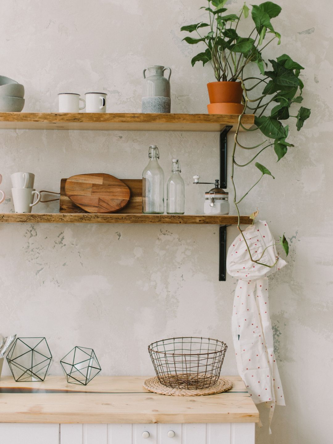 A estética das prateleiras abertas continua em alta, valorizando objetos pessoais e coleções únicas, como louças decorativas.