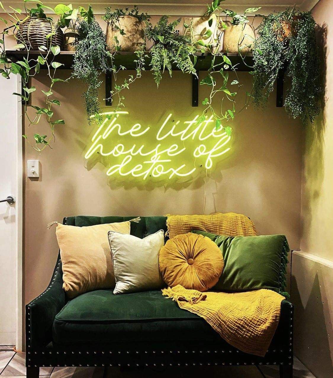 Quando se pensa em decoração dos anos 80, uma das características mais marcantes era o uso de luzes neon, que apareciam principalmente em luminárias e letreiros usados na parede.
