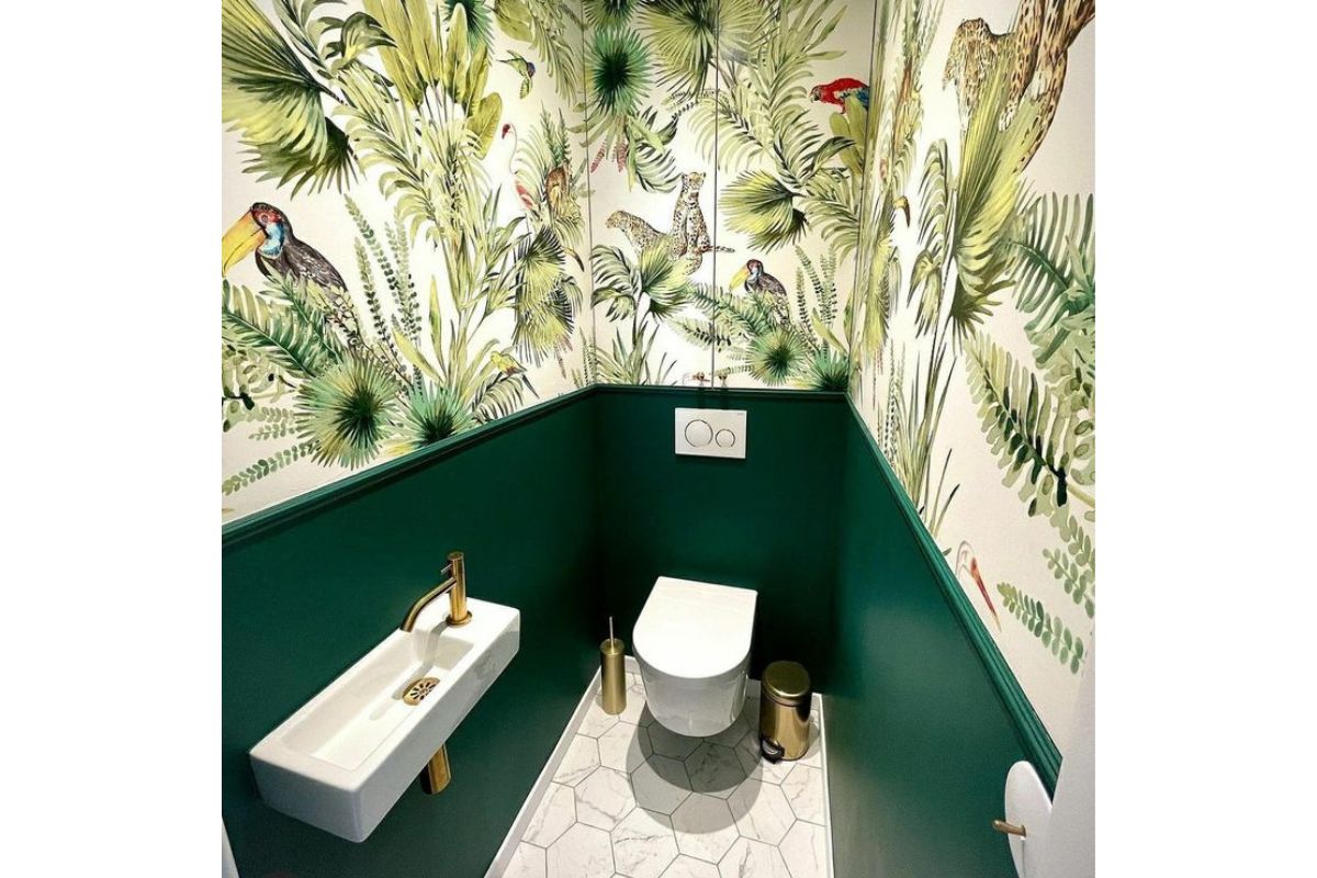 O papel de parede “urban jungle” traz uma fusão de natureza e modernidade, uma homenagem aos anos 80, mas com um toque de frescor atual.