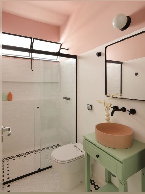 banheiro colorido com teto rosa