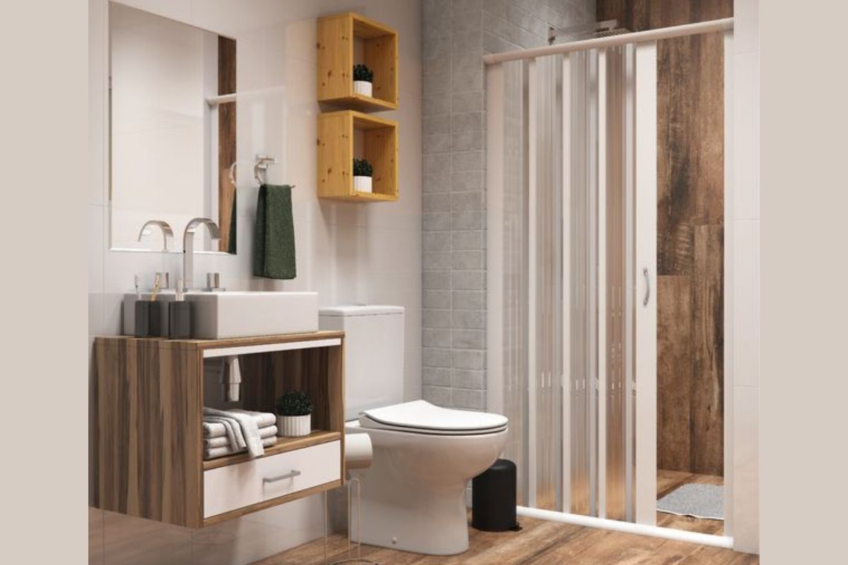 O box sanfonado é fácil de manter e oferece um toque de simplicidade elegante ao banheiro. Suas portas se abrem e se fecham com facilidade, tornando o acesso ao chuveiro conveniente.