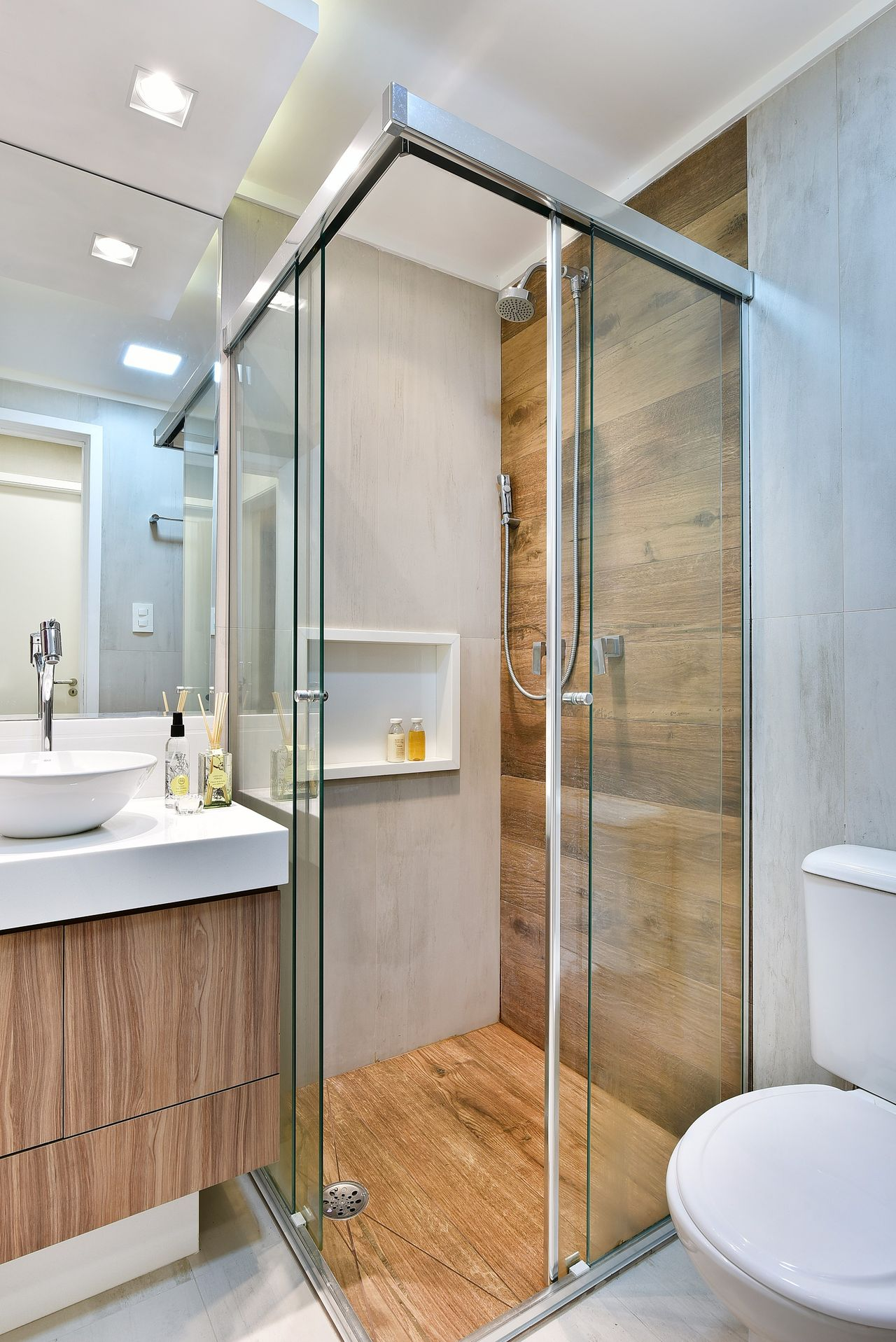 piso da área do box em madeira