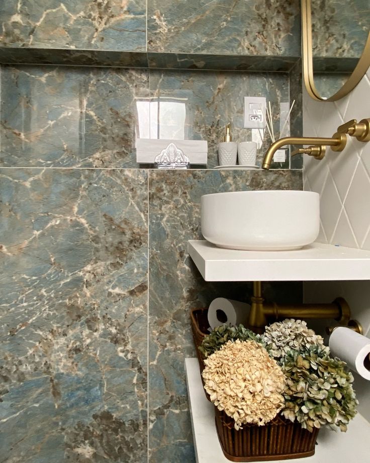 Antes de aplicar, teste amostras para garantir harmonia com os azulejos e metais existentes.
