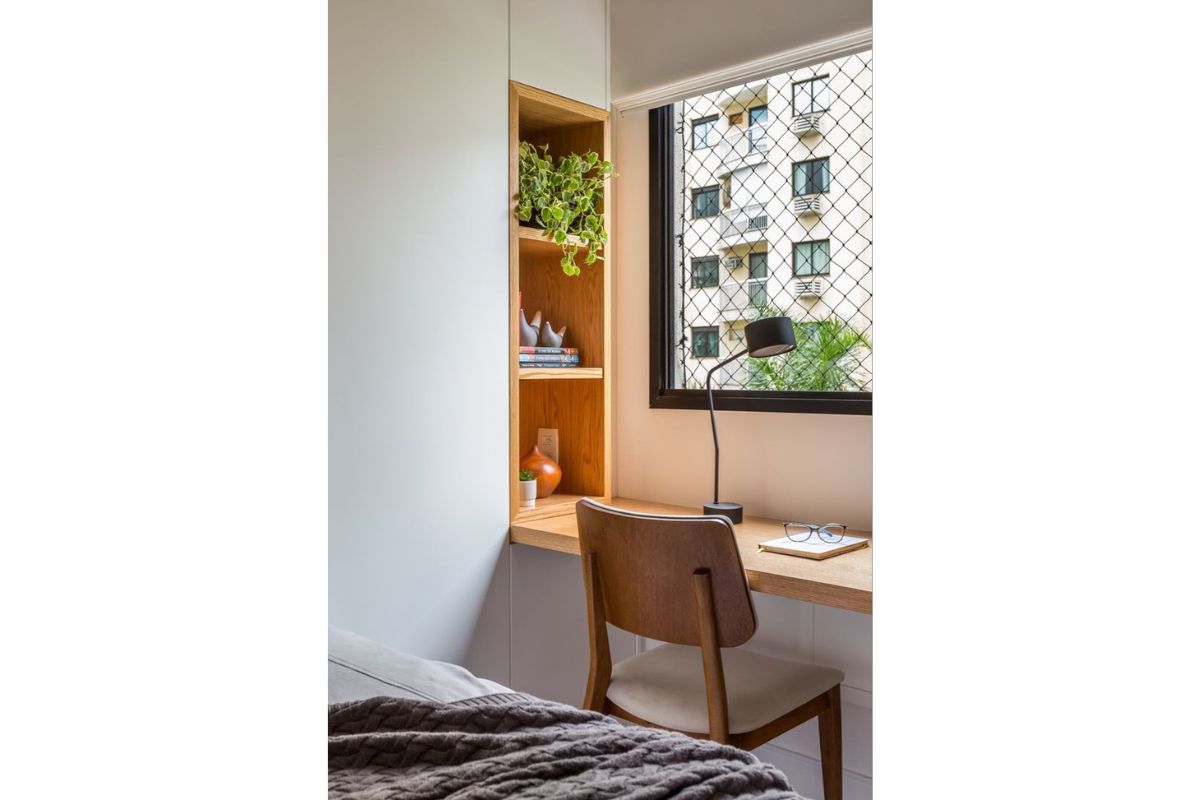 O agrupamento dessas duas soluções de armazenamento traz ainda mais possibilidades de decoração e organização para o quarto, oferecendo ainda uma quebra de padrões interessante na estética das paredes.